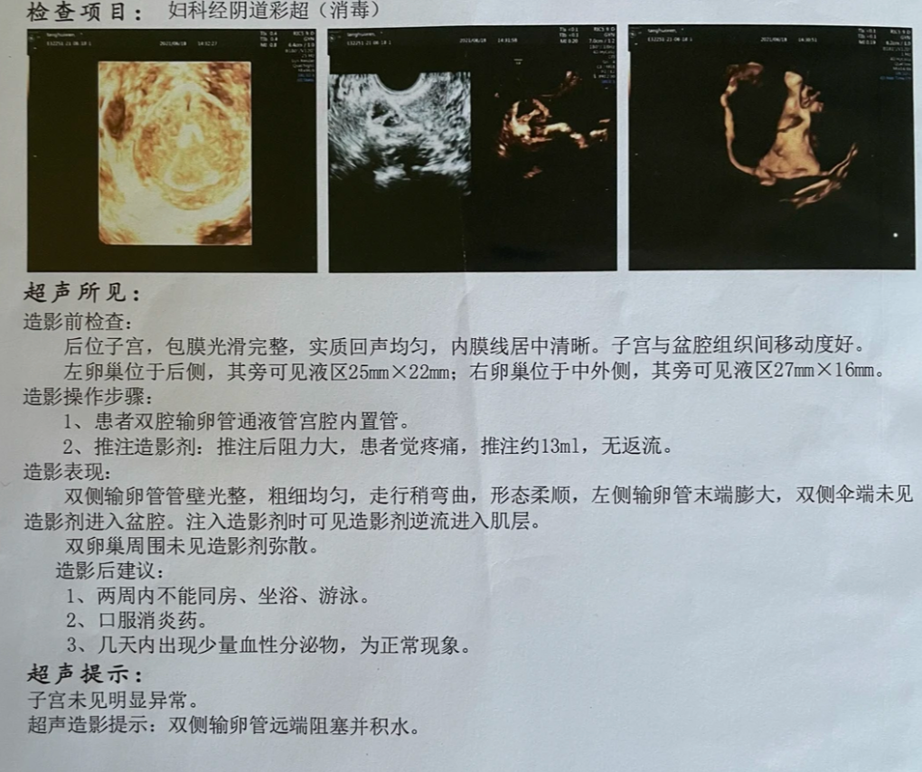 在郁金香国际生殖中心,专家团队为徐女士进行了系统化生育力评估。她月经周期规律,仅有轻微痛经,身体质量指数健康(身高162cm,体重61kg,BMI 23.2)。然而病史提示:2019年曾接受宫腹腔镜联合手术,2025年子宫输卵管造影明确显示“双侧输卵管梗阻伴积水”。