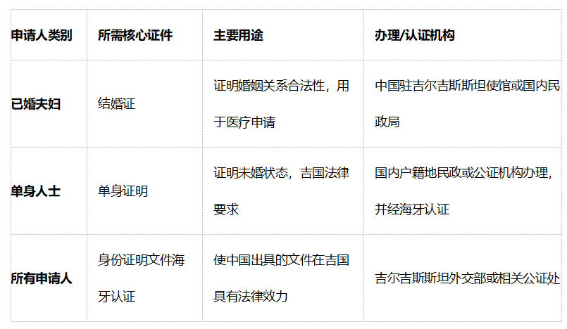 下表清晰地列出了不同人群在吉尔吉斯斯坦进行助孕所需的核心证件,你可以对号入座,快速了解自己需要准备哪些材料。