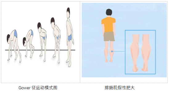 (1)儿童期:3-5岁开始发病,走路晚、易跌倒、爬楼梯困难。并逐渐出现Gower征(需用手撑腿起身),双侧腓肠肌假性肥大(脂肪堆积,看似粗壮实则无力)。