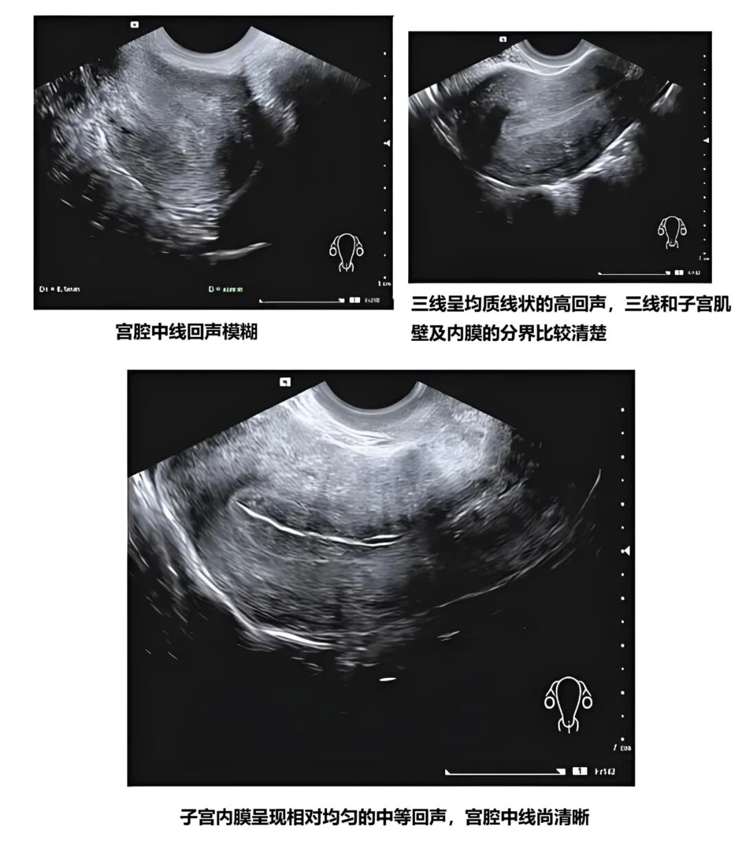 • 人工周期:在整个雌激素用药期间,只要无孕激素加入,“三线征”通常会一直维持。医生会持续监测,当子宫内膜厚度达到理想标准(通常>8mm)且三线征清晰时,使用孕激素转化内膜,即从“增殖期”向“分泌期”转化。在使用孕激素后,“三线征”逐渐消失。