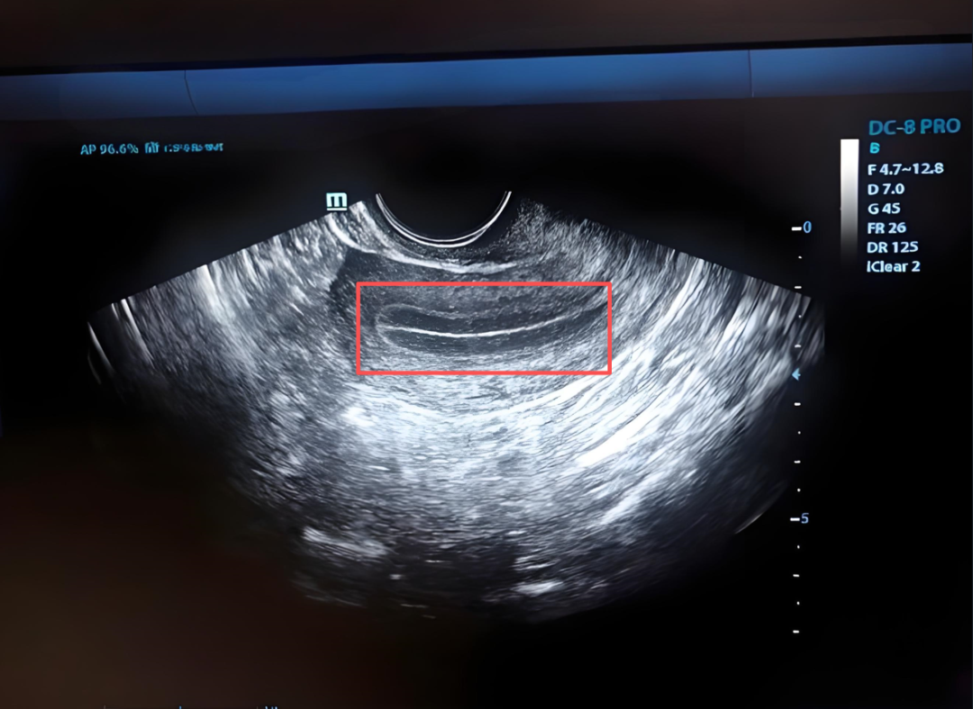• 自然周期排卵后(黄体期,第15-28天),内膜分泌期。在孕激素的作用下,子宫内膜会变得更加致密、均匀,腺体开始分泌营养物质。此时,两层内膜之间的界限变得模糊,宫腔线消失,内膜趋于稳定,厚度也几乎不再变化,整个内膜变为均匀的高回声,看起来就像一条单一的、明亮的厚线,“三线征”也随之消失。