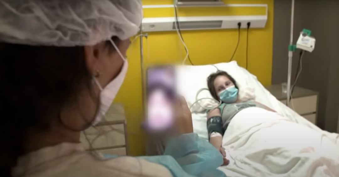 机构的护士向客户远程展示刚分娩完的孕母