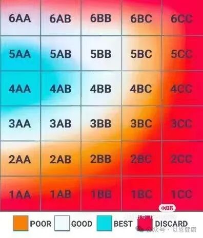 报告中第一个数字(3-6)是表示囊胚的发育阶段,第二个字母是胚胎内部细胞团的质量(A-D,A最好),第三个字母代表胚胎外部滋养层的质量(A-D,A最好)。