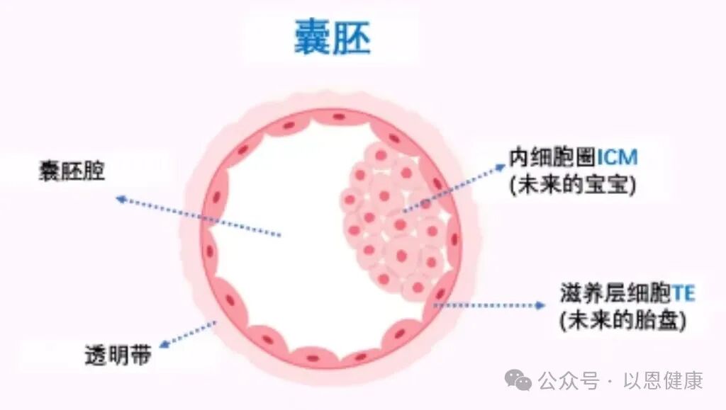 根据囊胚腔的大小和是否孵化,将囊胚发育分为6个时期,1~2期的囊胚统称为早期囊胚(EB);3~6期的为囊胚,而培养到第5-6天的囊胚,主要是由囊胚腔、内细胞团、滋养层细胞组成。根据内细胞团和滋养层细胞,分为A、B、C三个等级,A级优于B级,B级优于C级。