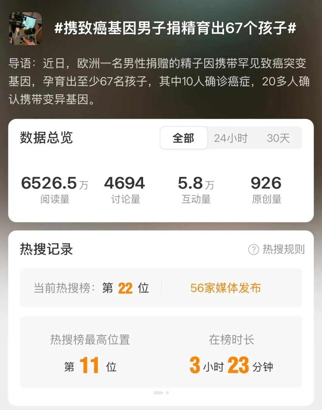 微博热搜一则“携致癌基因男子捐精育出67个孩子”话题的出现,瞬间吸引了无数网友的目光。