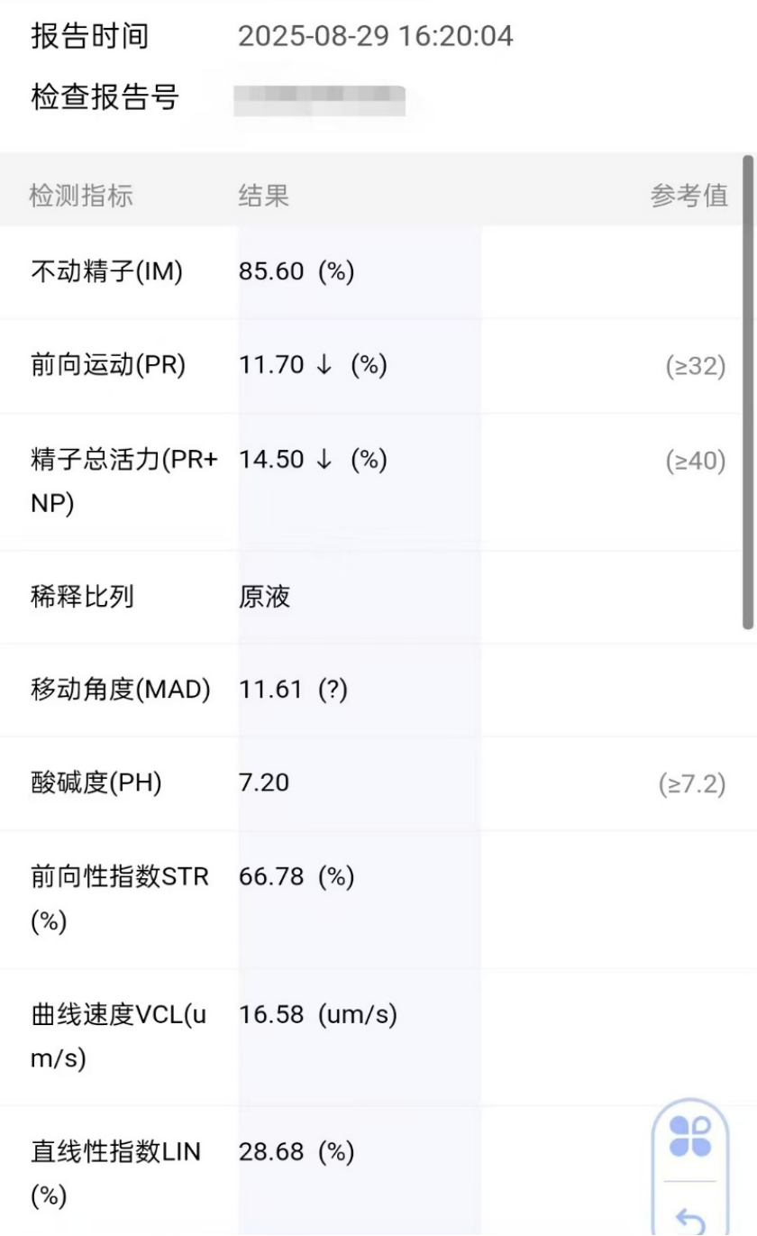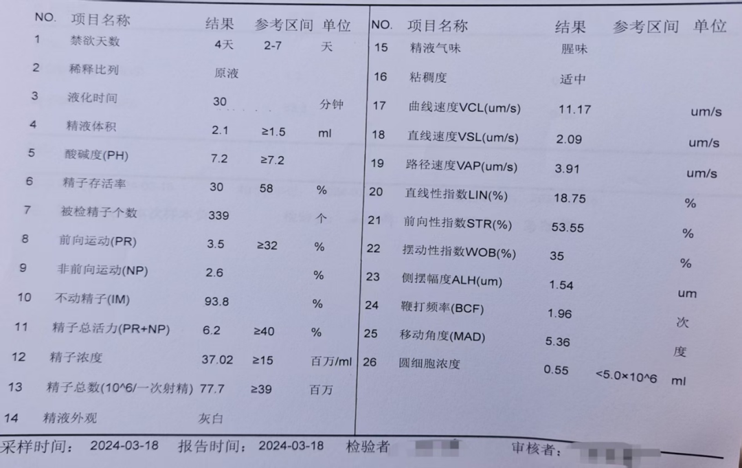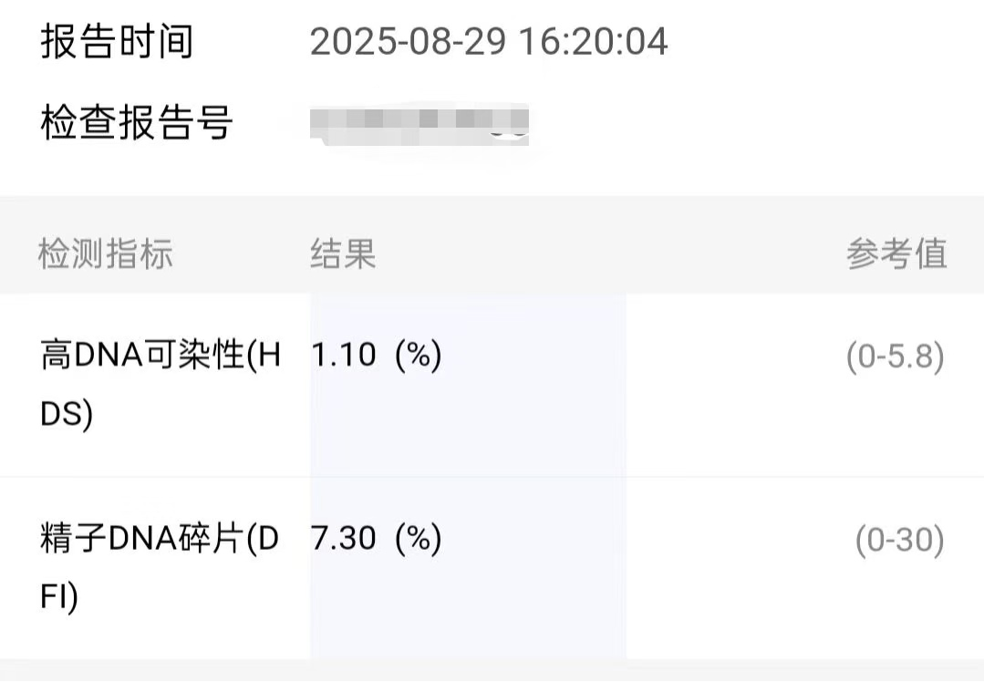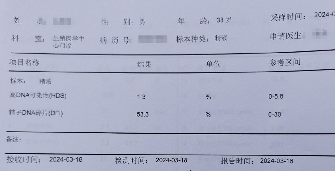 这位小伙伴去年检查的指标很不理想,经过正规治疗和精子调理精子质量有很大提升!虽然精子活力还不是很理想,但是精子形态和精子的碎片化(DFI)都已经达到合格标准!