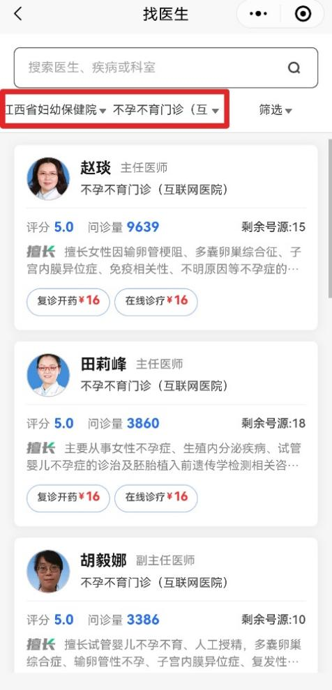 若您选择赵琰、胡毅娜、何锦霞主任,请选择“不孕不育门诊”→“女性不孕门诊”对应专家号至南区就诊。