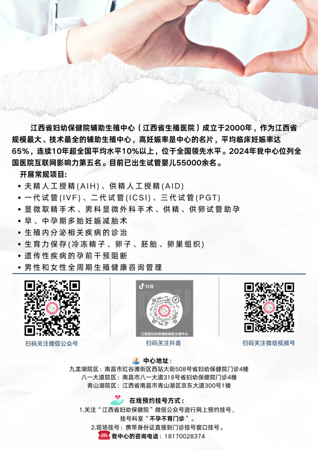 想了解更多诊疗知识,扫描我们的微信公众号“江西省妇幼保健院江西省生殖医院”。进入历史消息查看更多信息。