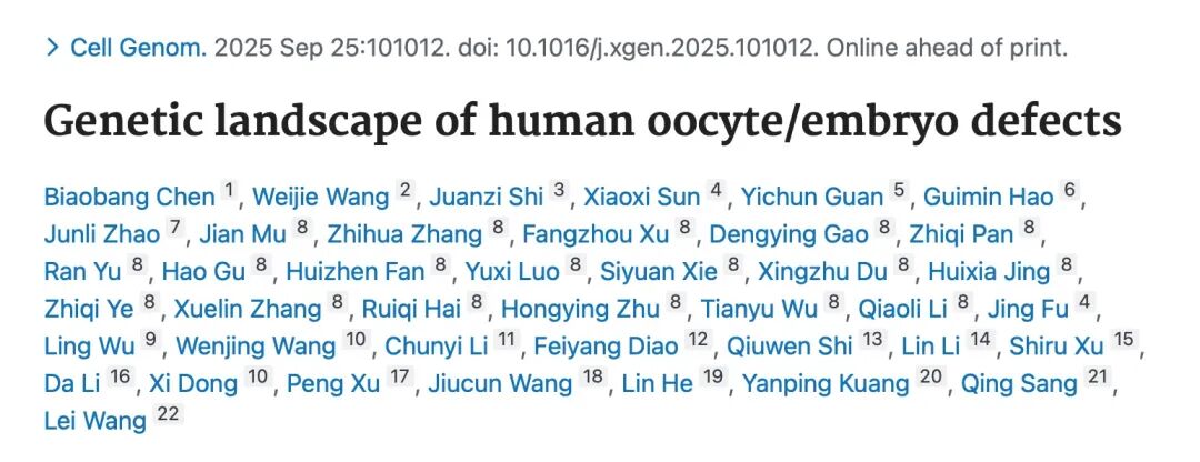 参考文献Genetic landscape of human oocyte/embryo defects. Cell Genom. 2025 Sep 25:101012. doi: 10.1016/j.xgen.2025.101012. Epub ahead of print.