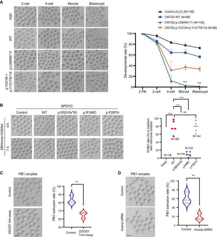 比如研究者把人的突变CNTD2基因注入小鼠受精卵,发现胚胎果然停止发育了;降低小鼠卵子中DDOST基因的量,发现卵子成熟受阻。