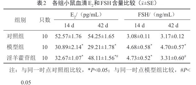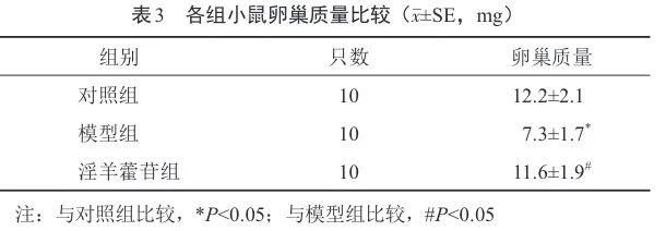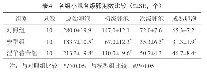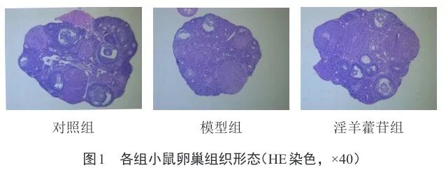 这表明淫羊藿通过降低模型小鼠血清FSH水平,提高E2水平,增加小鼠卵巢质量和卵泡数量,从而增强卵巢储备功能,对环磷酰胺所致的小鼠卵巢早衰有明显的治和缓解作用。