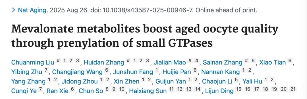 参考文献Mevalonate metabolites boost aged oocyte quality through prenylation of small GTPases. Nat Aging. 2025 Aug 26. doi: 10.1038/s43587-025-00946-7. Epub ahead of print.