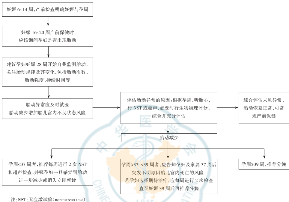孕妇自觉胎动减少就医后,应建议行无应激试验(non-stress test,NST)或超声等检查,综合并充分地评估胎儿宫内状态和胎动异常的原因,结合孕周及胎动恢复情况决定临床处理策略。(证据等级:2b,推荐强度:B)