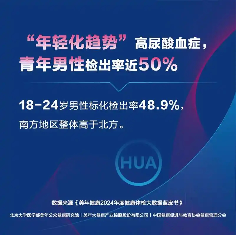 根据《2025年版北京市体检人群抽样健康报告》与《美年健康2024年度健康体检大数据蓝皮书》双双指出,高尿酸血症已超越血糖、血压问题,紧随脂肪肝之后,稳坐“第二把交椅”。