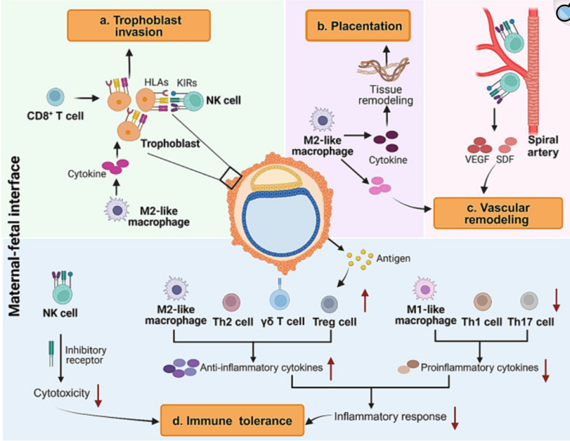 在母胎界面,子宫内膜免疫细胞主要通过四种方式助力妊娠:(a)自然杀伤细胞(NK 细胞)、M2 型巨噬细胞及 CD8+T 细胞分别通过杀伤细胞免疫球蛋白样受体(KIRs)和细胞因子分泌,调控早孕期间的滋养层细胞侵袭;(b)M2 型巨噬细胞通过分泌细胞因子调控组织重塑,从而促进胎盘发育;(c)NK 细胞和 M2 型巨噬细胞通过产生细胞因子,参与血管重塑;(d)NK 细胞细胞毒性降低,同时巨噬细胞和 T 细胞下调炎症反应,进而促进免疫耐受。