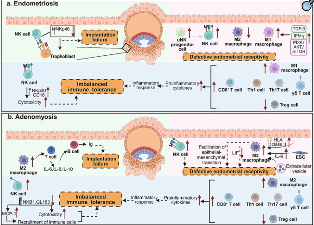 (a)子宫内膜异位症中,自然杀伤细胞(NK 细胞)激活受体下调,导致其与滋养层细胞相互作用减弱,可能引发胚胎着床失败。同时,子宫自然杀伤细胞(uNK)祖细胞、NK 细胞及 M1 型巨噬细胞数量异常增多,可能导致子宫内膜容受性受损。此外,NK 细胞细胞毒性增强,且 M1 型巨噬细胞与 T 细胞分泌的促炎细胞因子增多,共同引发过度炎症反应。(b)子宫腺肌症中,M2 型巨噬细胞数量异常增多,可能通过调控 T 细胞、B 细胞活化导致着床失败。进一步而言,M2 型巨噬细胞与 NK 细胞数量升高可损害子宫内膜容受性。同时,NK 细胞细胞毒性增强、免疫细胞募集作用及 M2 型巨噬细胞与 T 细胞分泌的促炎细胞因子增多,共同驱动促炎反应,破坏母体免疫耐受。