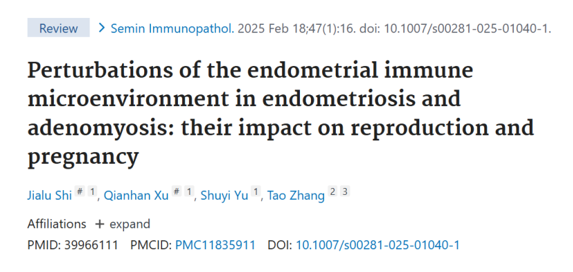 参考文献:Shi J, Xu Q, Yu S, Zhang T. Perturbations of the endometrial immune microenvironment in endometriosis and adenomyosis: their impact on reproduction and pregnancy. Semin Immunopathol. 2025 Feb 18;47(1):16. doi: 10.1007/s00281-025-01040-1. PMID: 39966111; PMCID: PMC11835911.