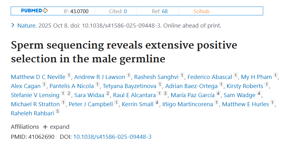 Neville MDC, Lawson ARJ, Sanghvi R, Abascal F, Pham MH, Cagan A, Nicola PA, Bayzetinova T, Baez-Ortega A, Roberts K, Lensing SV, Widaa S, Alcantara RE, García MP, Wadge S, Stratton MR, Campbell PJ, Small K, Martincorena I, Hurles ME, Rahbari R. Sperm sequencing reveals extensive positive selection in the male germline. Nature. 2025 Oct 8.