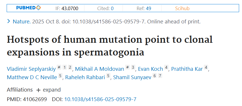 Seplyarskiy V, Moldovan MA, Koch E, Kar P, Neville MDC, Rahbari R, Sunyaev S. Hotspots of human mutation point to clonal expansions in spermatogonia. Nature. 2025 Oct 8.