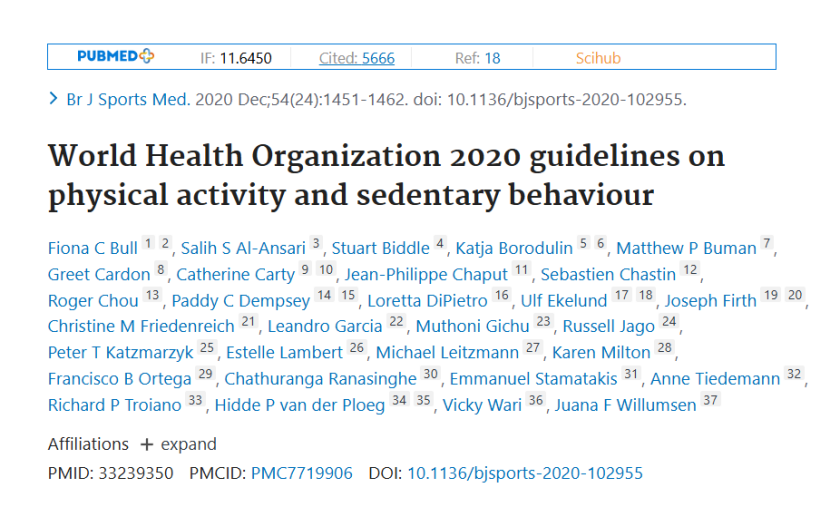 Bull FC, Al-Ansari SS, Biddle S, Borodulin K, Buman MP, Cardon G, Carty C, Chaput JP, Chastin S, Chou R, Dempsey PC, DiPietro L, Ekelund U, Firth J, Friedenreich CM, Garcia L, Gichu M, Jago R, Katzmarzyk PT, Lambert E, Leitzmann M, Milton K, Ortega FB, Ranasinghe C, Stamatakis E, Tiedemann A, Troiano RP, van der Ploeg HP, Wari V, Willumsen JF. World Health Organization 2020 guidelines on physical activity and sedentary behaviour. Br J Sports Med. 2020 Dec;54(24):1451-1462. PMID: 33239350.