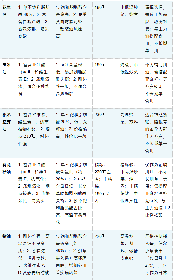 3. 搭配亚麻籽油补ω-3,偶尔用橄榄油、茶籽油替换,参考对比表按需选择;