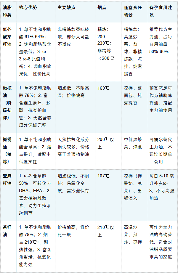 四、常见家庭烹饪用油对比表,备孕选油一目了然