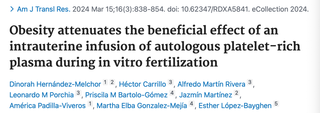 Obesity attenuates the beneficial effect of an intrauterine infusion of autologous platelet-rich plasma during in vitro fertilization. Am J Transl Res. 2024 Mar 15;16(3):838-854. doi: 10.62347/RDXA5841.