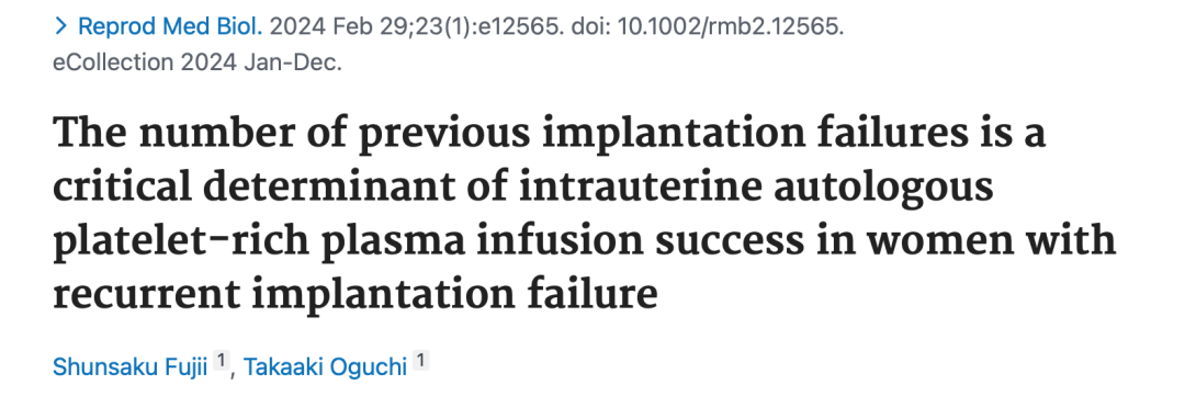 The number of previous implantation failures is a critical determinant of intrauterine autologous platelet-rich plasma infusion success in women with recurrent implantation failure. Reprod Med Biol. 2024 Feb 29;23(1):e12565. doi: 10.1002/rmb2.12565.
