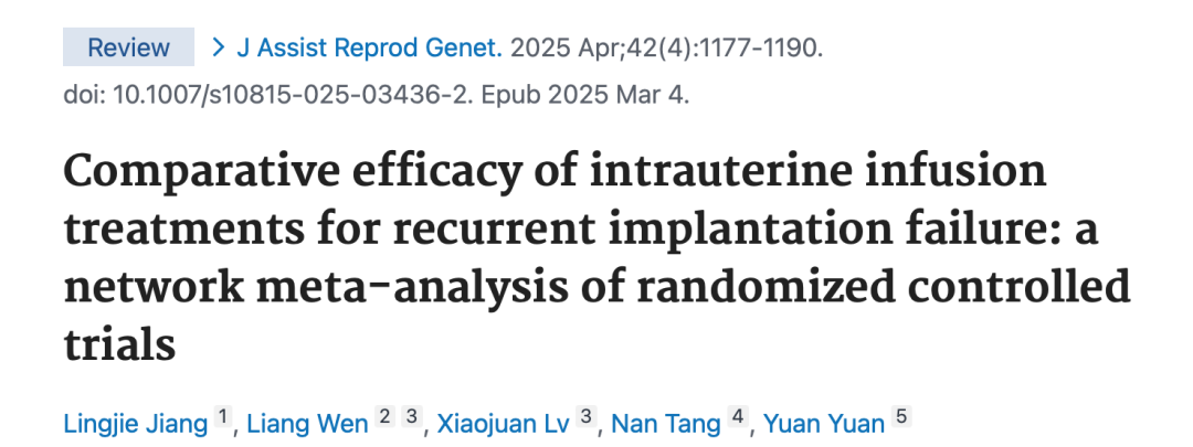 参考文献Comparative efficacy of intrauterine infusion treatments for recurrent implantation failure: a network meta-analysis of randomized controlled trials. J Assist Reprod Genet. 2025 Apr;42(4):1177-1190. doi: 10.1007/s10815-025-03436-2. Epub 2025 Mar 4.