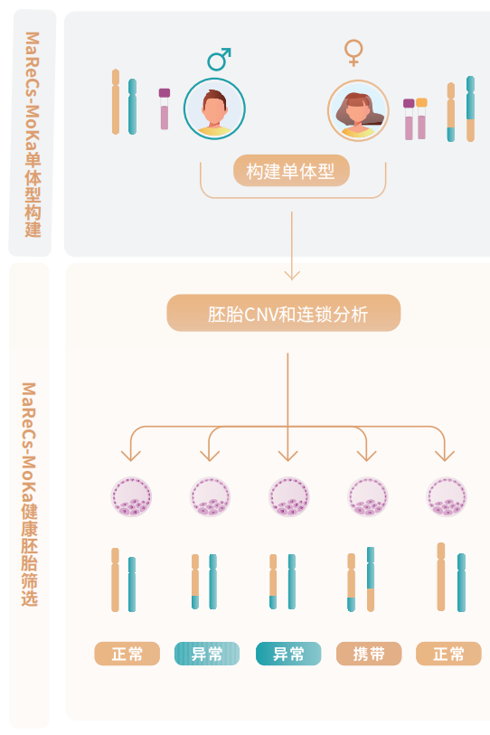 MaReCs-MoKa利用C-MoKa技术,只需男女双方外周血样本,即可同时实现染色体结构异常携带者的核型复核和无家系、无参考胚的单体型构建,阻断染色体结构异常向子代传递,助力生育健康宝宝。
