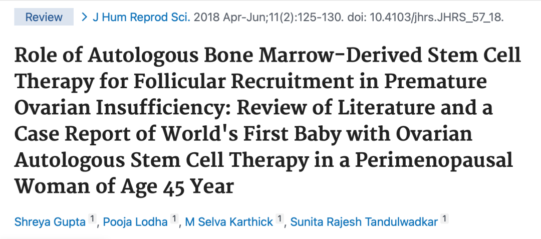 参考文献Role of Autologous Bone Marrow-Derived Stem Cell Therapy for Follicular Recruitment in Premature Ovarian Insufficiency: Review of Literature and a Case Report of World's First Baby with Ovarian Autologous Stem Cell Therapy in a Perimenopausal Woman of Age 45 Year. J Hum Reprod Sci. 2018 Apr-Jun;11(2):125-130. doi: 10.4103/jhrs.JHRS_57_18.