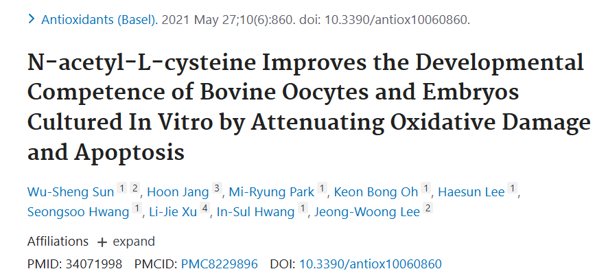 1.Cheng L, Shi Z, Yue Y, Wang Y, Qin Y, Zhao W, Hu Y, Li Q, Guo M, An L, Wang S, Tian J. Dietary supplementation with N-acetyl-L-cysteine ameliorates hyperactivated ERK signaling in the endometrium that is linked to poor pregnancy outcomes following ovarian stimulation in pigs. J Anim Sci Biotechnol. 2024 Nov 6;15(1):148. doi: 10.1186/s40104-024-01109-1. PMID: 39501409; PMCID: PMC11539329.2.Sun WS, Jang H, Park MR, Oh KB, Lee H, Hwang S, Xu LJ, Hwang IS, Lee JW. N-acetyl-L-cysteine Improves the Developmental Competence of Bovine Oocytes and Embryos Cultured In Vitro by Attenuating Oxidative Damage and Apoptosis. Antioxidants (Basel). 2021 May 27;10(6):860. doi: 10.3390/antiox10060860. PMID: 34071998; PMCID: PMC8229896.3.Truong TT, Soh YM, Gardner DK. Antioxidants improve mouse preimplantation embryo development and viability. Hum Reprod. 2016 Jul;31(7):1445-54. doi: 10.1093/humrep/dew098. Epub 2016 May 10. PMID: 27165621.4.Cheng L, Shi Z, Yue Y, Wang Y, Qin Y, Zhao W, Hu Y, Li Q, Guo M, An L, Wang S, Tian J. Dietary supplementation with N-acetyl-L-cysteine ameliorates hyperactivated ERK signaling in the endometrium that is linked to poor pregnancy outcomes following ovarian stimulation in pigs. J Anim Sci Biotechnol. 2024 Nov 6;15(1):148. doi: 10.1186/s40104-024-01109-1. PMID: 39501409; PMCID: PMC11539329.5.Novoselec J, Klir Šalavardić Ž, Đidara M, Novoselec M, Vuković R, Ćavar S, Antunović Z. The Effect of Maternal Dietary Selenium Supplementation on Blood Antioxidant and Metabolic Status of Ewes and Their Lambs. Antioxidants (Basel). 2022 Aug 26;11(9):1664. doi: 10.3390/antiox11091664. PMID: 36139738; PMCID: PMC9495837.6.Broman M, Lindfors M, Norberg Å, Hebert C, Rooyackers O, Wernerman J, Fläring U. Low serum selenium is associated with the severity of organ failure in critically ill children. Clin Nutr. 2018 Aug;37(4):1399-1405. doi: 10.1016/j.clnu.2017.06.014. Epub 2017 Jun 21. PMID: 28689669.7.Huwiler VV, Maissen-Abgottspon S, Stanga Z, Mühlebach S, Trepp R, Bally L, Bano A. Selenium Supplementation in Patients with Hashimoto Thyroiditis: A Systematic Review and Meta-Analysis of Randomized Clinical Trials. Thyroid. 2024 Mar;34(3):295-313. doi: 10.1089/thy.2023.0556. Epub 2024 Feb 16. PMID: 38243784; PMCID: PMC10951571.8.Rostami R, Nourooz-Zadeh S, Mohammadi A, Khalkhali HR, Ferns G, Nourooz-Zadeh J. Serum Selenium Status and Its Interrelationship with Serum Biomarkers of Thyroid Function and Antioxidant Defense in Hashimoto's Thyroiditis. Antioxidants (Basel). 2020 Oct 31;9(11):1070. doi: 10.3390/antiox9111070. PMID: 33142736; PMCID: PMC7692168.9.Hondal RJ. Selenium vitaminology: The connection between selenium, vitamin C, vitamin E, and ergothioneine. Curr Opin Chem Biol. 2023 Aug;75:102328. doi: 10.1016/j.cbpa.2023.102328. Epub 2023 May 24. PMID: 37236134; PMCID: PMC10524500.